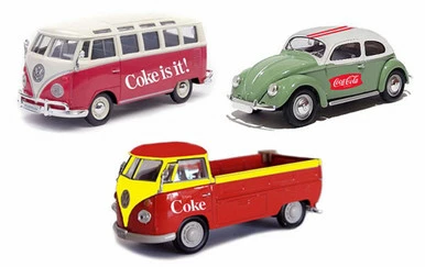 - Coca-Cola – Volkswagen 3-Piece Gift Set Includes the following mounted on a display stand: 1962 VW Samba Bus, 1966 VW Beetle, 1962 VW T1 Pickup